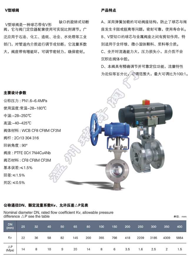 V型球閥是球閥的一種,它的關閉件是半球體上開有V字型開口,V型開口具有鋒利的刃口,在球體回轉過程中,關閉件之間有擦拭作用,對介質具有強有力的切斷力,球體的V型開口與閥座流道形成一個扇形區(qū)域,在回轉過程中可改變流道截面積,形成對介質的精確調節(jié),它是一種角回轉的調節(jié)閥,其密封性能與普通球閥相同,使它同時具備調節(jié)和開關兩種功能,與氣動或電動執(zhí)行器配套,廣泛使用于工業(yè)過程自控系統中。產品特點: