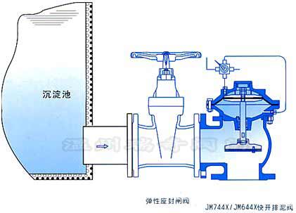 快開液動(dòng)氣動(dòng)排泥閥JM744X/JM644X,是一種由液壓源或氣動(dòng)泊作執(zhí)行機(jī)構(gòu)的角型截?cái)囝愰y門。通常成排安裝在常常池底部外側(cè)壁,用以排除池底常常的泥砂和污物。該閥由尼龍強(qiáng)化橡膠隔膜將閥門分為兩啊腔室,接通液壓或氣動(dòng)源,采用電動(dòng)或手動(dòng)二位四通換向閥控制,實(shí)現(xiàn)快速排泥。該閥將隔膜代替活塞,無(wú)運(yùn)動(dòng)摩擦,更適用于泥漿等顆粒介質(zhì),大大提高了閥門的使用壽命。