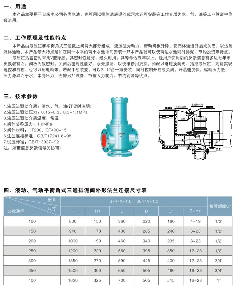 液動、氣動平衡角式三通排泥閥由液壓缸和平衡角式三通截止閥兩大部分組成,液壓缸為動力、帶動閥板升降,使閥體通道開啟或關閉,以達到流體通斷,液動三通排泥閥,氣動三通排泥閥最大特點是如在同一水平的兩個水池中間安裝一只本產品就可以使兩邊水池同時排泥,節約投資等特點。