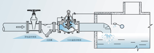 口向水池注水,實(shí)現(xiàn)自動(dòng)補(bǔ)水.液位控制精度準(zhǔn)確,不受水壓干擾;100X隔膜式遙控浮球閥可隨水池的高度及使用